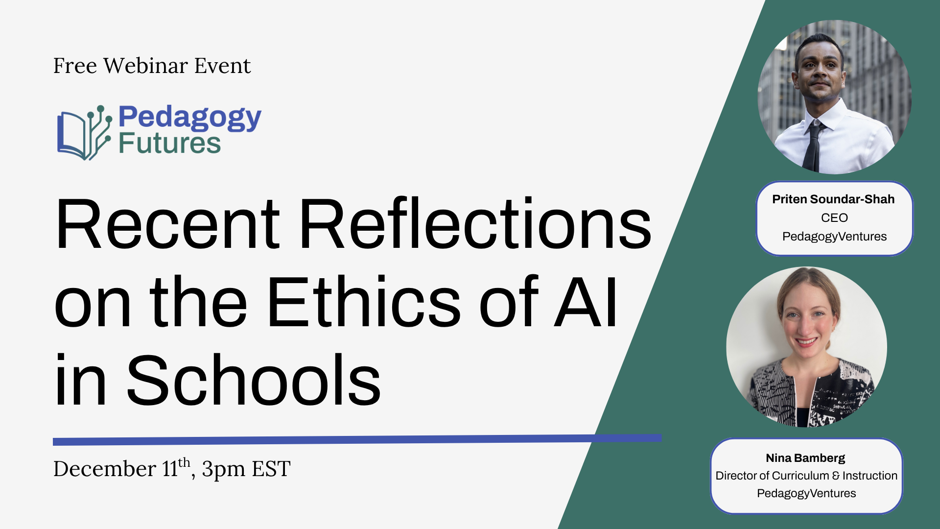 PedagogyVentures CEO, Priten Soundar-Shah, will share new insights on the ethics of AI in schools that he gained while writing his new book Ethical EdTech: How Educators Can Lead on AI and Digital Safety in K-12.